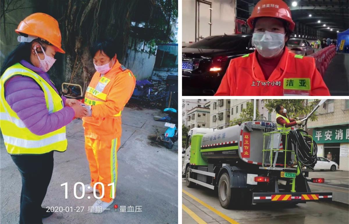 他们都是来自大满贯各个项目的一线环卫工人,都有一个共同的名字——“抗疫楷模”。在疫情发生后,他们主动放弃春节假期,第一时间加入到各个项目的应急防控小组,加班加点,主动请缨,到疫情最严重的地方开展防疫消杀工作,每天平均工作在12小时以上。她们有的背负着几十斤的消毒液,每天行走在大街小巷上进行消毒工作,有的在危险的隔离区处理废弃的带有病毒的口罩和垃圾,有的全副武装进入隔离住户进行消毒作业……他们都抱着“疫情不结束,我们不休息”的状态投入到每天的工作中,她们没有轰轰烈烈的誓言和豪言壮志,只有默默地坚守和奉献在平凡的工作岗位上……